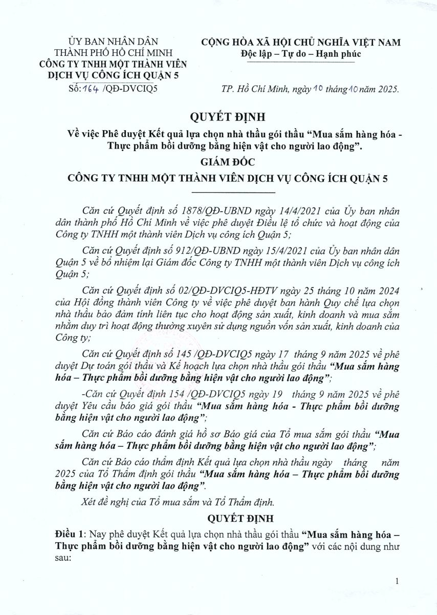 Quyết định về việc Phê duyệt kết quả lựa chọn nhà thầu " Mua sắm hàng hóa - Thực Phẩm bồi dưỡng bằng hiện vật cho người lao động"