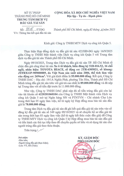 Thông báo V/v công bố đơn vị trúng chào giá mua tài sản thanh lý xe ép rác hiệu HINO biển số 51C-211.84 của Công ty TNHH Một thành viên Dịch vụ công ích quận 5