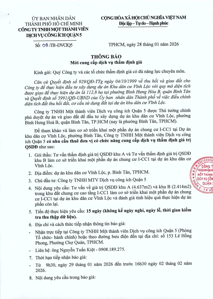 THÔNG BÁO Mời cung cấp dịch vụ thẩm định giá