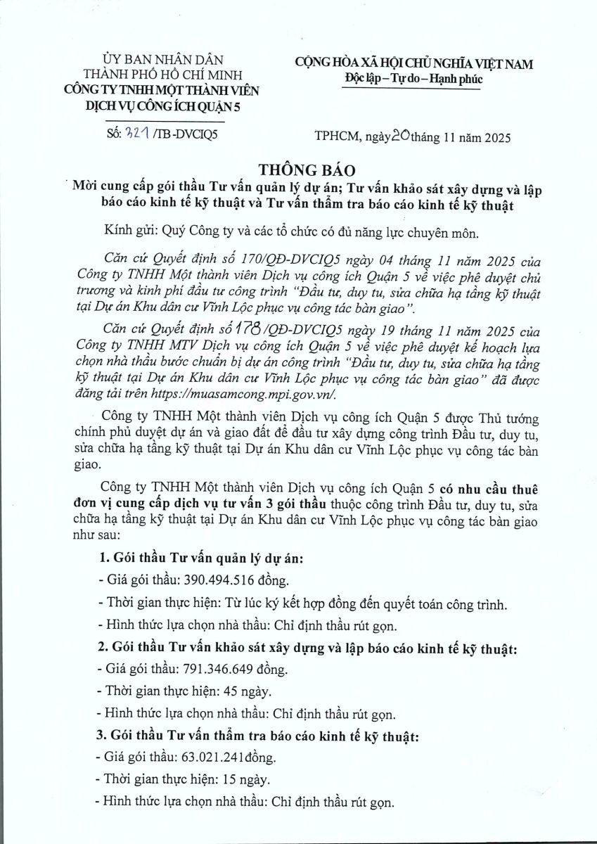 THÔNG BÁO Mời cung cấp gói thầu Tư vấn quản lý dự án; Tư vấn khảo sát xây dựng và lập báo cáo kinh tế kỹ thuật và Tư vấn thấm tra báo cáo kinh tế kỹ thuật